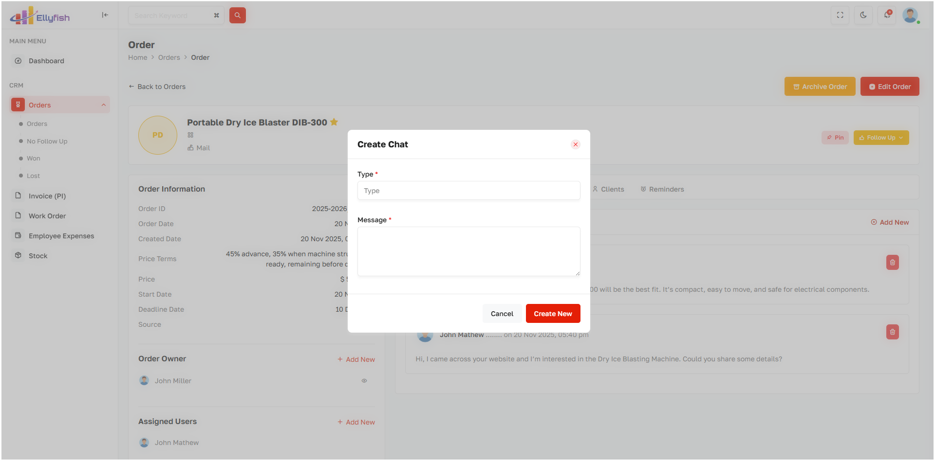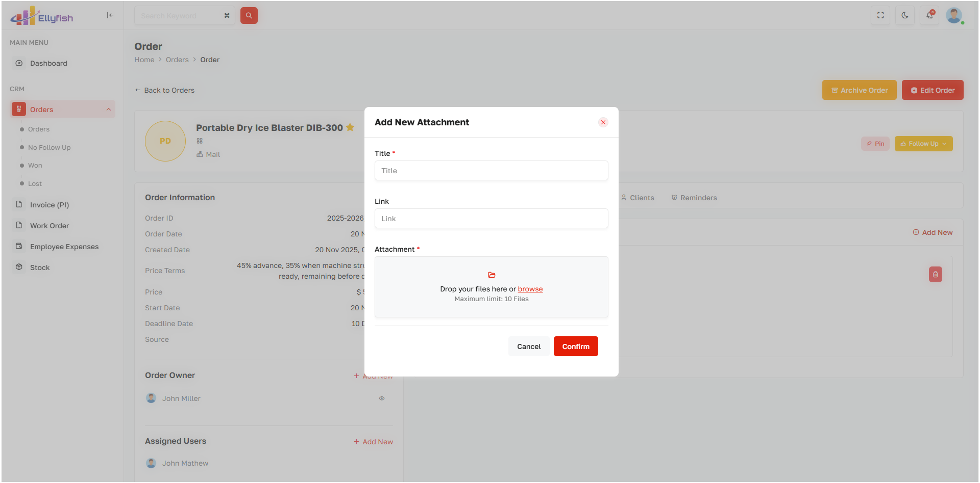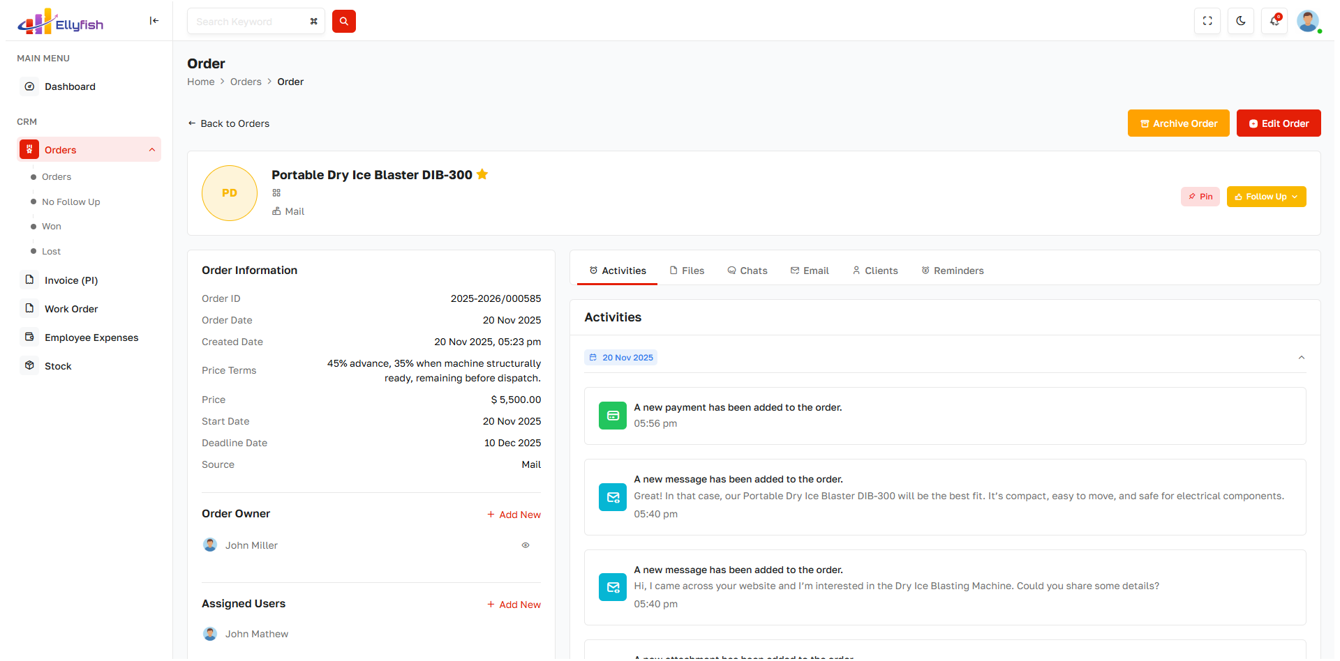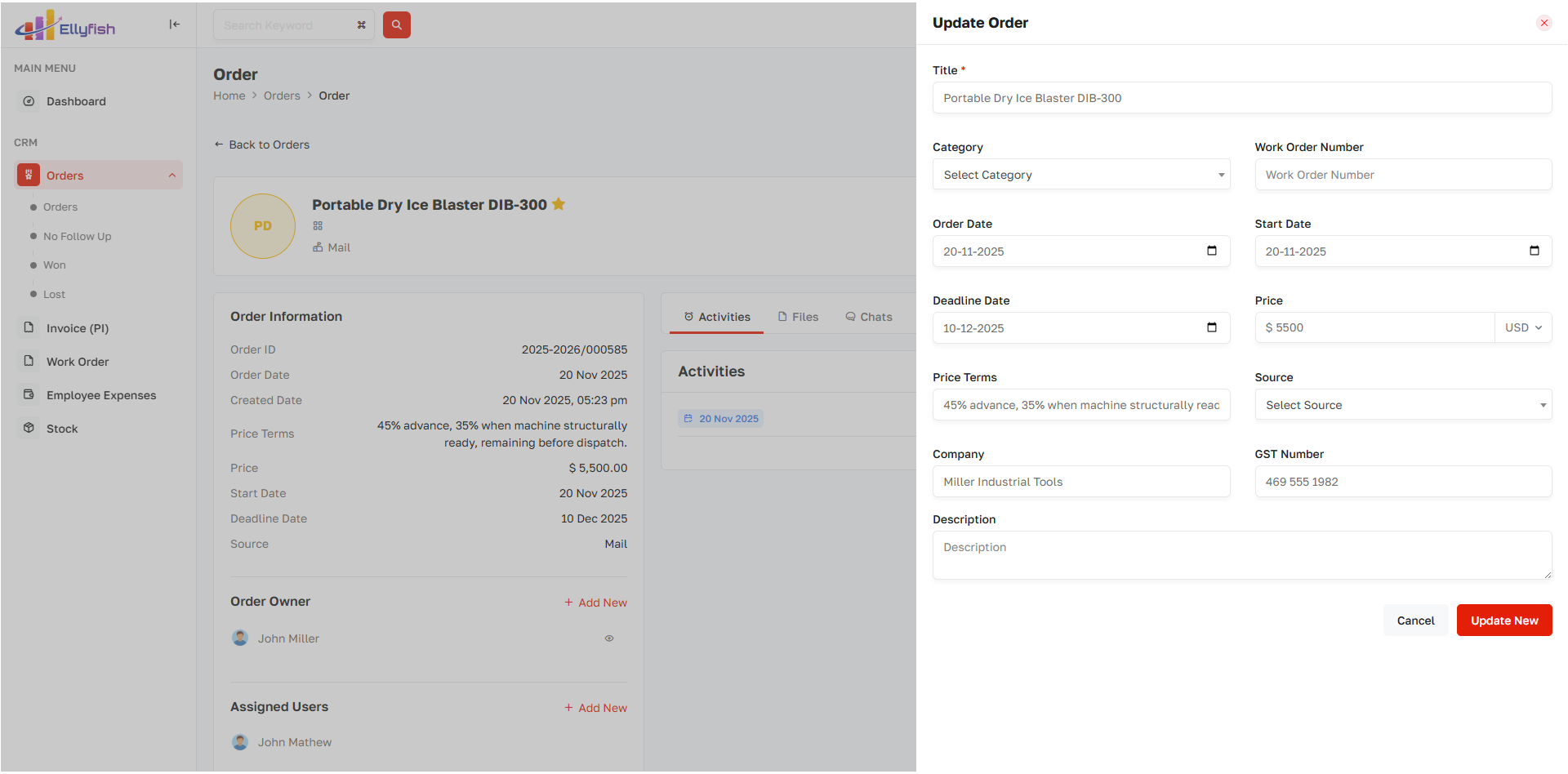 Generate orders directly from closed deals with approval and status tracking.