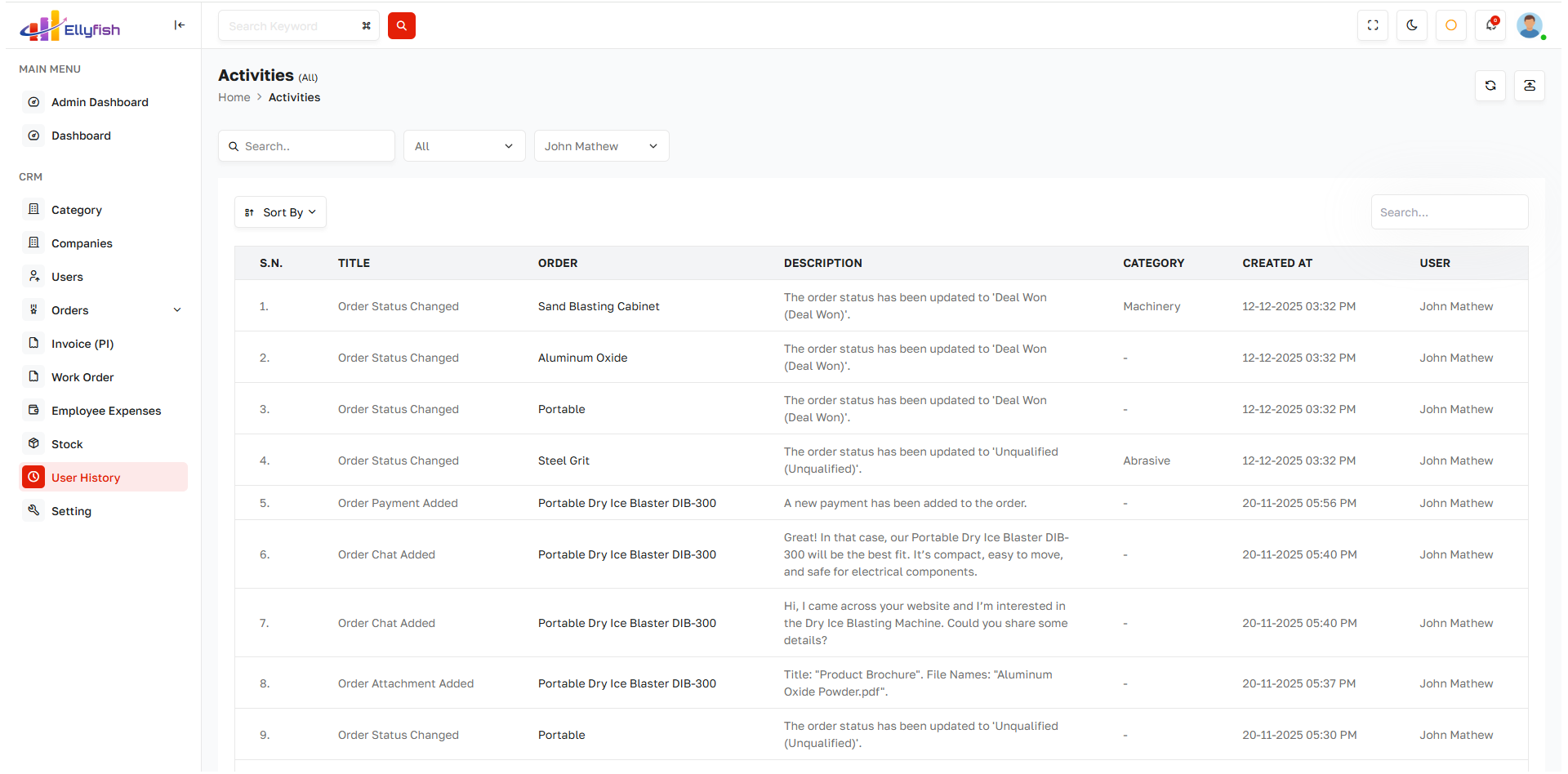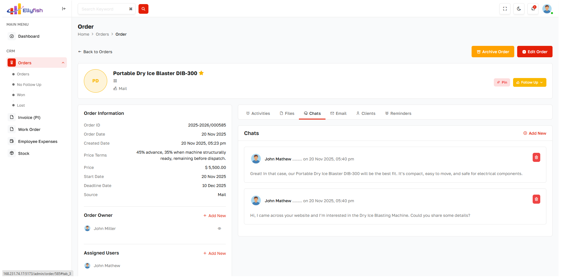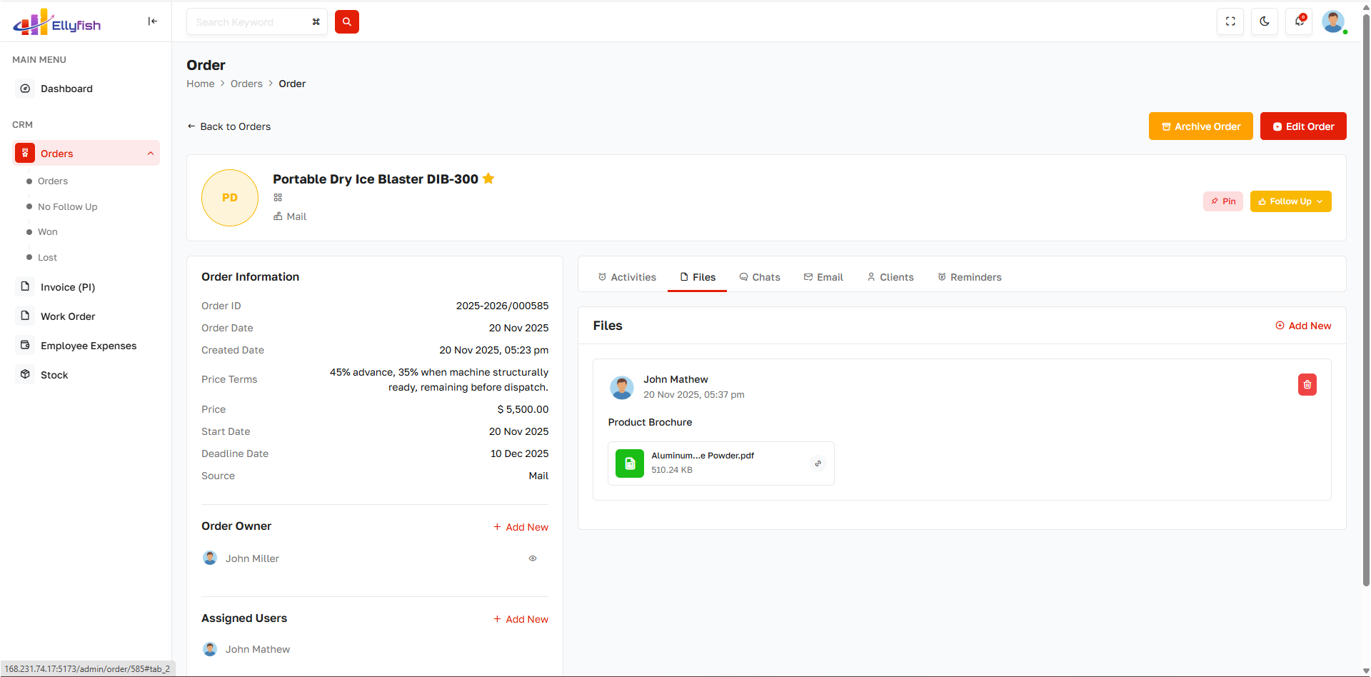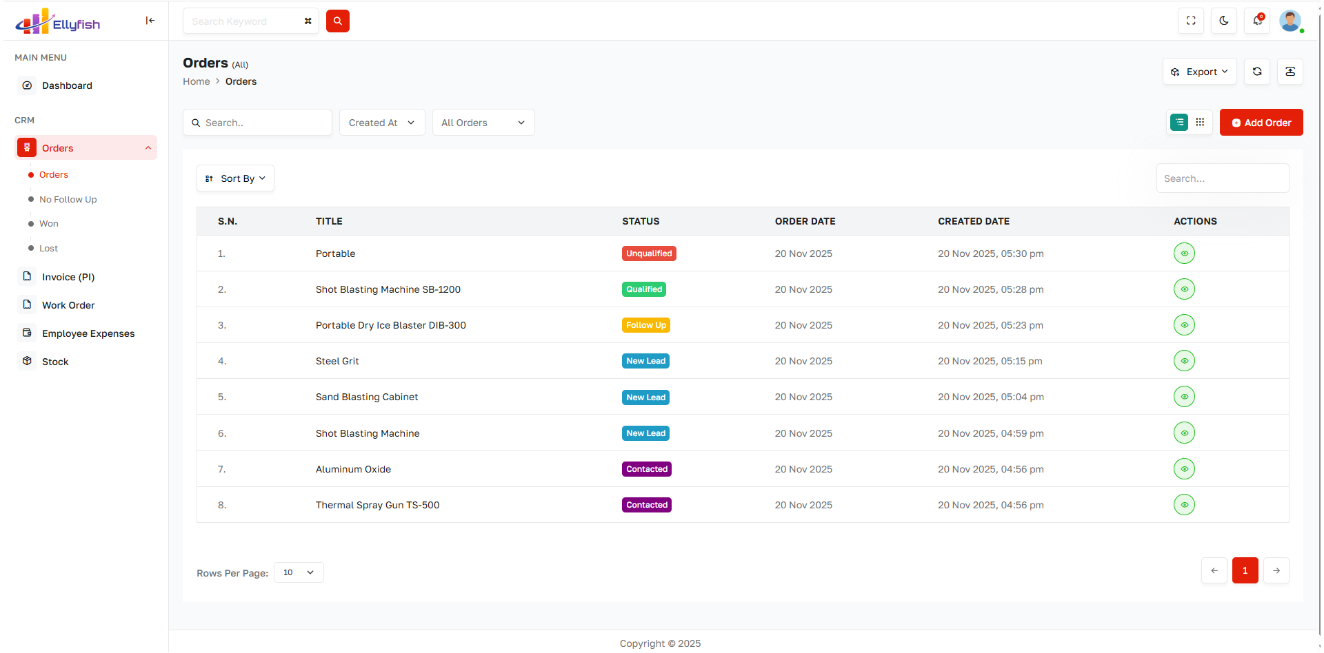 Generate orders directly from closed deals with approval and status tracking.